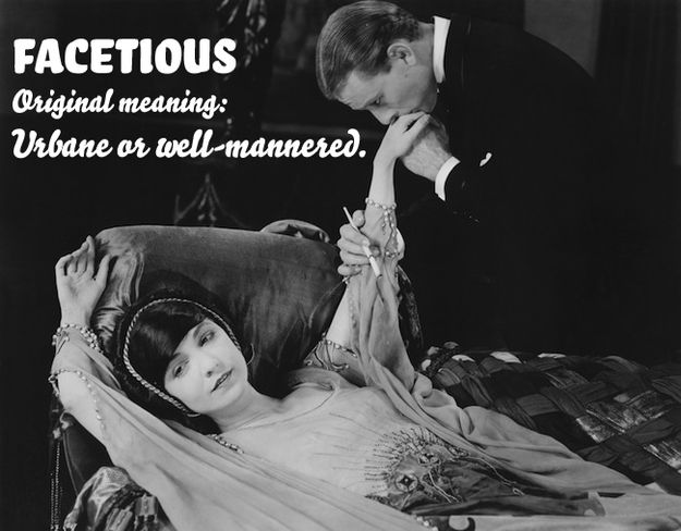 In my research on the word, I found that a century ago, facetious had a very different meaning, ‘urbane or well-mannered.’ It got me thinking. So many of the words I am learning by doing these Words of the Day used to have very different meanings, either decades ago or centuries ago. I find that intriguing. It means that the human race is ever changing. We are not stagnant and dying. It gives me hope for the future. How about you? What do you think?
